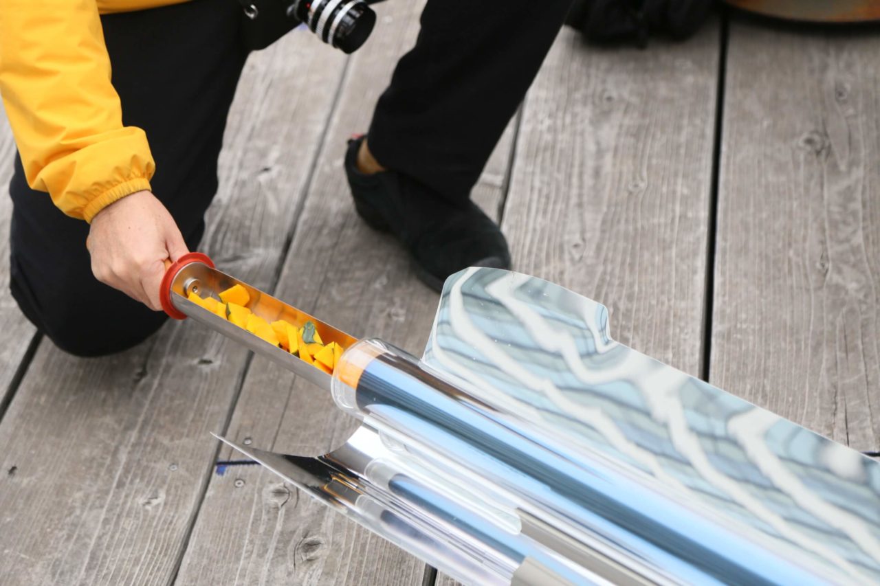 太陽の熱で野菜や肉も焼ける。ソーラークッカー